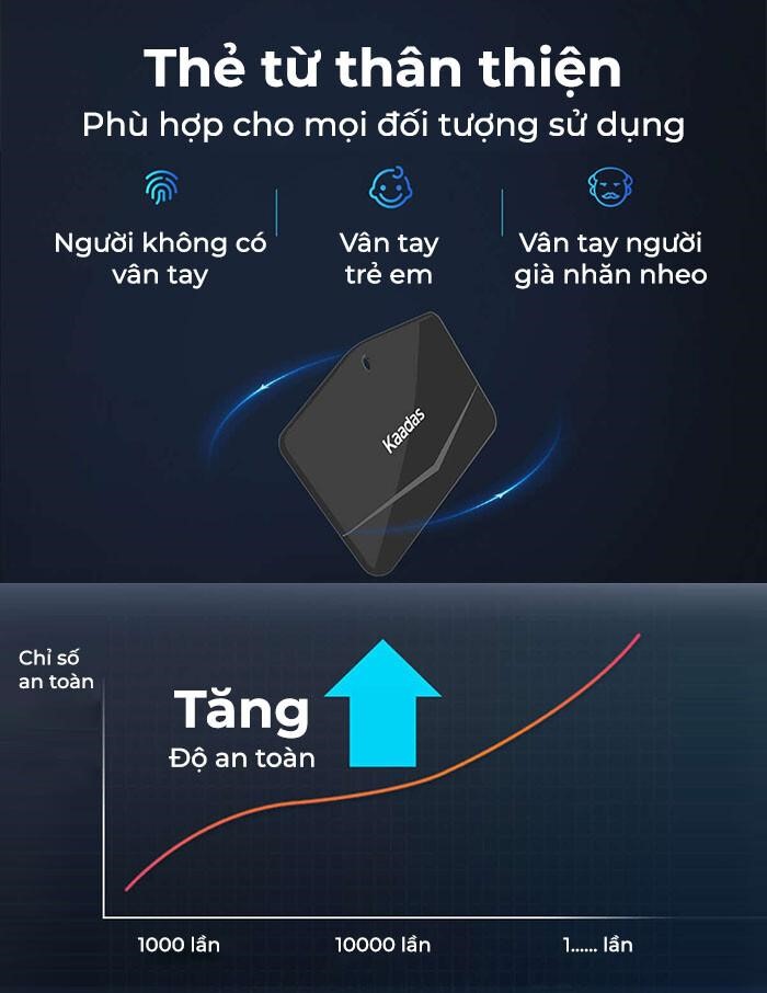 - Kaadas Q3 đăng ký được 100 vân tay, 100 thẻ từ, 1 mã số chủ, 20 mã số người dùng, mã số khách (dùng 1 lần). Có sẵn: 2 thẻ từ nhỏ, 2 chìa cơ. Khi cần có thể mua thêm phụ kiện để mở bằng điều khiển từ xa