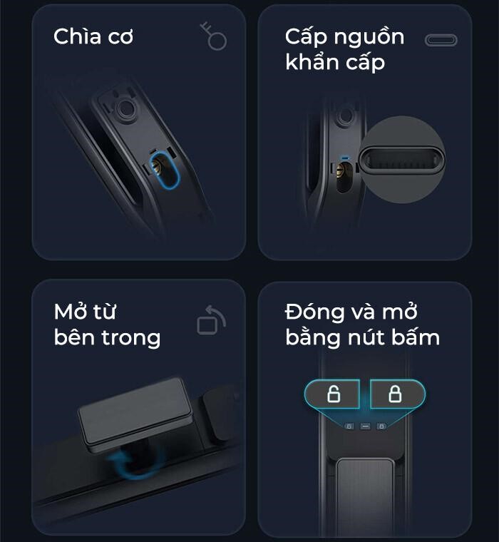 Khóa được trang bị nhiều cách thức mở như: vân tay, mã số, thẻ từ, chìa cơ