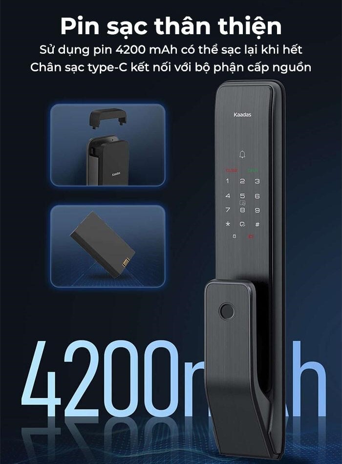 Khóa sử dụng pin sạc với dung lượng lớn. Dùng được khoảng 1000 lần mở cho 1 lần sạc (tức khoảng 3 tháng, với trung bình mở 10 lần/ ngày)