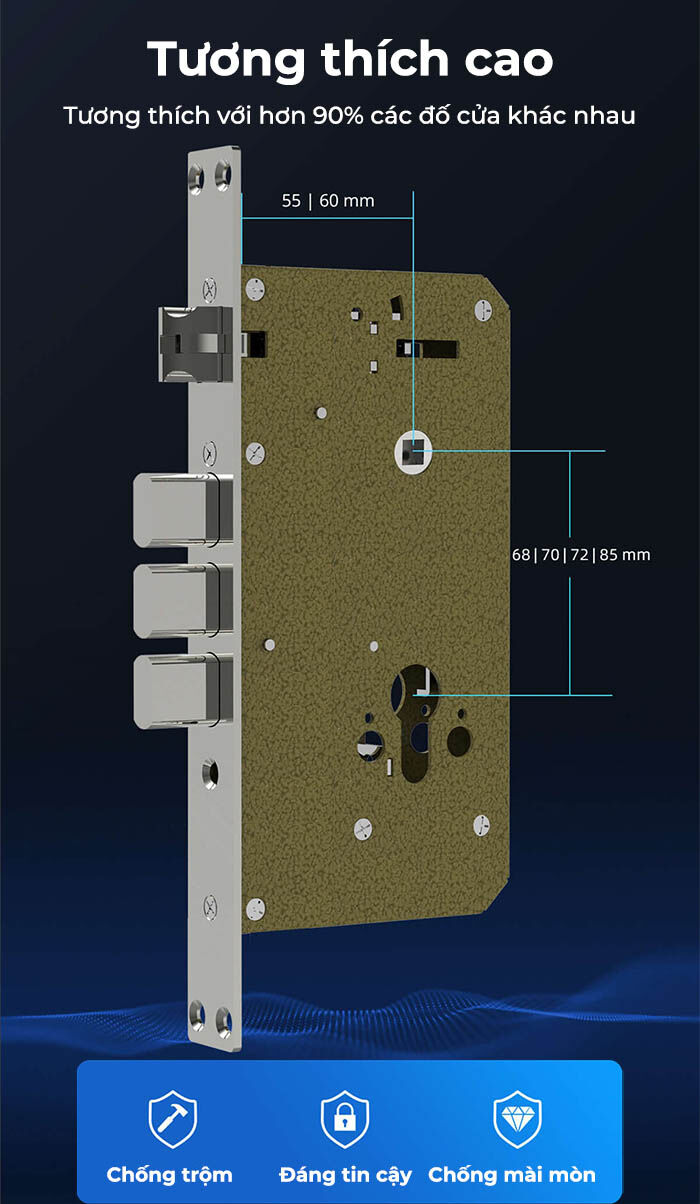 - Phù hợp cho cửa dày: 38- 120mm, đố cửa rộng từ 100mm trở lên